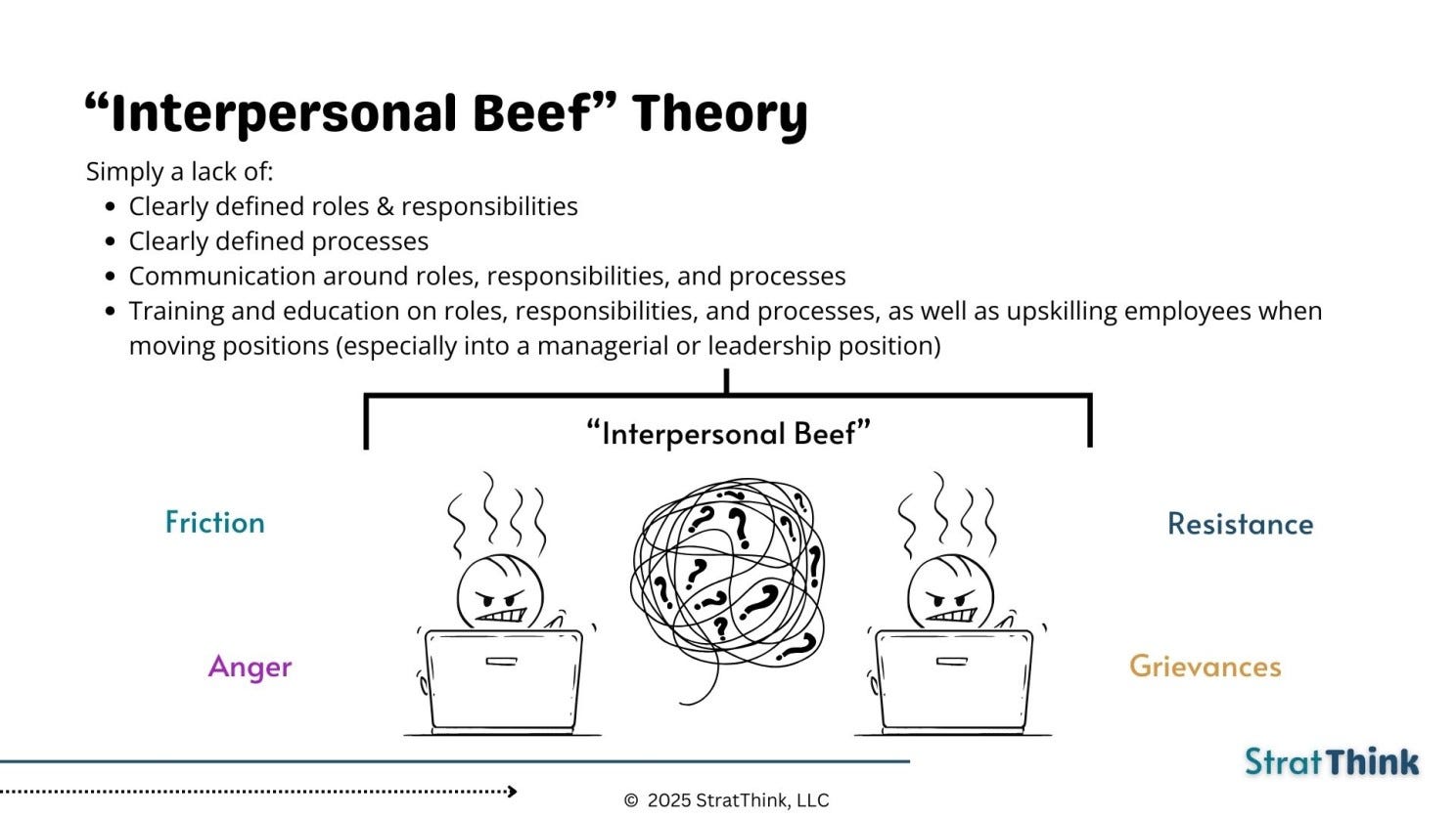 Leads to “interpersonal beef” which comes across as tension, friction, anger, frustration, resistance, and grievances between employees and teams.