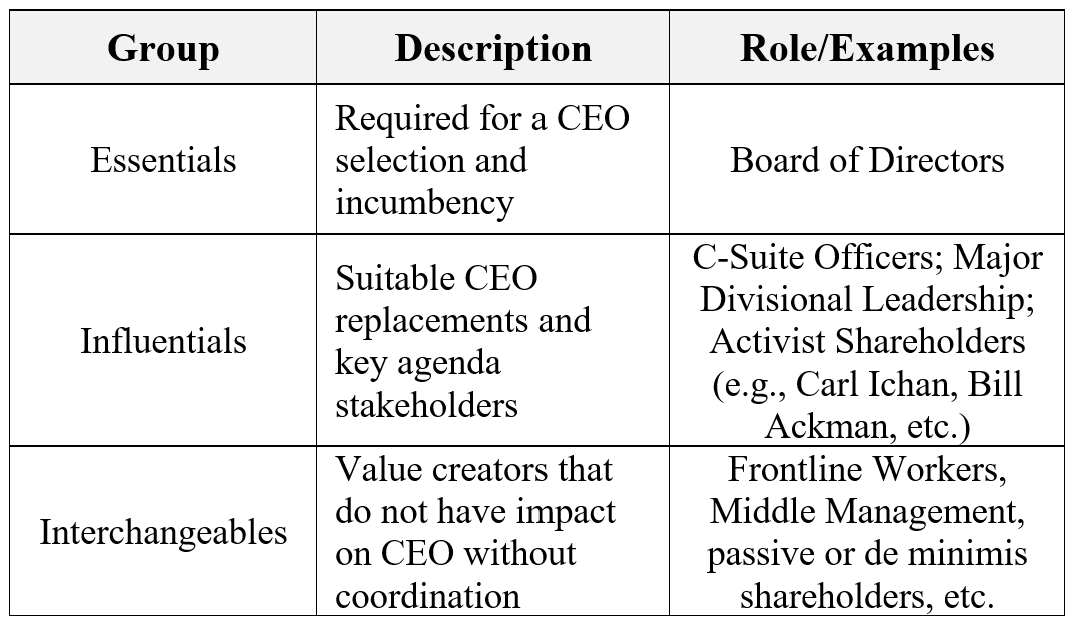 In a corporate setting, CEOs lead companies and are selected by the board of directors. The board itself is elected by the shareholders. In The Dictator’s Handbook framework, Interchangeables are the frontline workers and up to its middle management. These groups can have nominal stakes but have no real ability to pick a slate of directors and get them elected or pick the CEO. The Influentials, on the other hand, can be senior executives, institutional investors, potential acquirers, high-profile analysts, and bankers, all of whom can be board members, alternative CEO candidates, or outside power brokers. Senior executives within a company are extremely key stakeholders in executing a CEO’s agenda and protecting their incumbency. However, those executives are also potential CEO replacements, if they get the opportunity to offer better business plans to the board. But unless they have board positions, they are not Essentials. Corporate boards vote directly on CEOs and their compensation, and, therefore, no one can be CEO without board support. Therefore, they are the Essentials. This is all summarized in Exhibit 1.