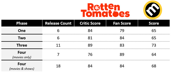 An increase in quantity does allow more opportunities for quality to slip, but it also gives an opportunity for a rebound. In Phase 4, Thor: Love and Thunder and Eternals became two of Marvel’s lowest rated movies on Rotten Tomatoes and Metacritic. As you’ll see in the chart below, this drove the average Phase 4 Rotten Tomatoes and Metacritic score to the lowest of any phase. However, when you factor in the 7 Disney+ shows, then Phase 4’s average scores look more normal.